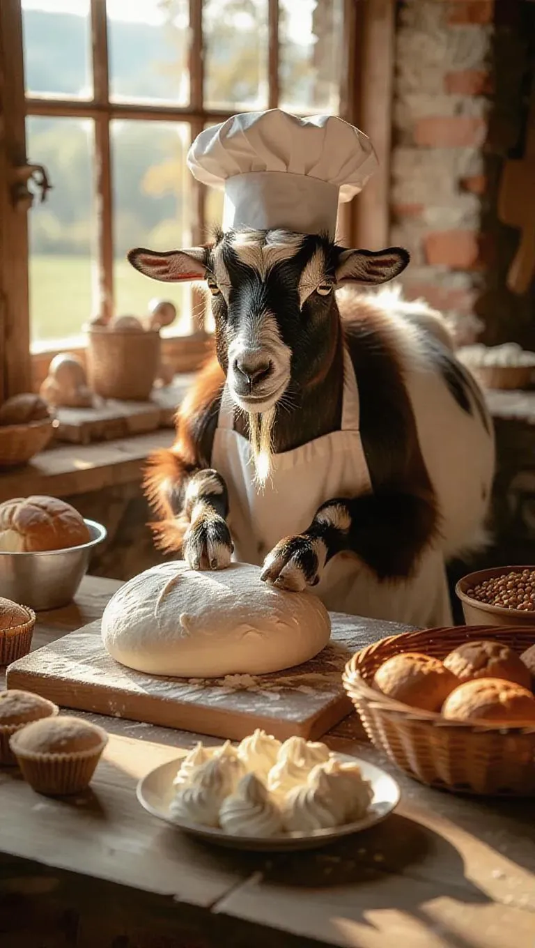 Animal chefs in a rustic, farm-style kitchen. Goat wearing a chef hat, kneading bread dough. Dirt tiles, warm sunlight shining through open doors. Cow churning butter, chicken collecting eggs. Fresh loaves, creamy butter, farm-fresh muffins. Earthy, homey, hearty, comforting mood.