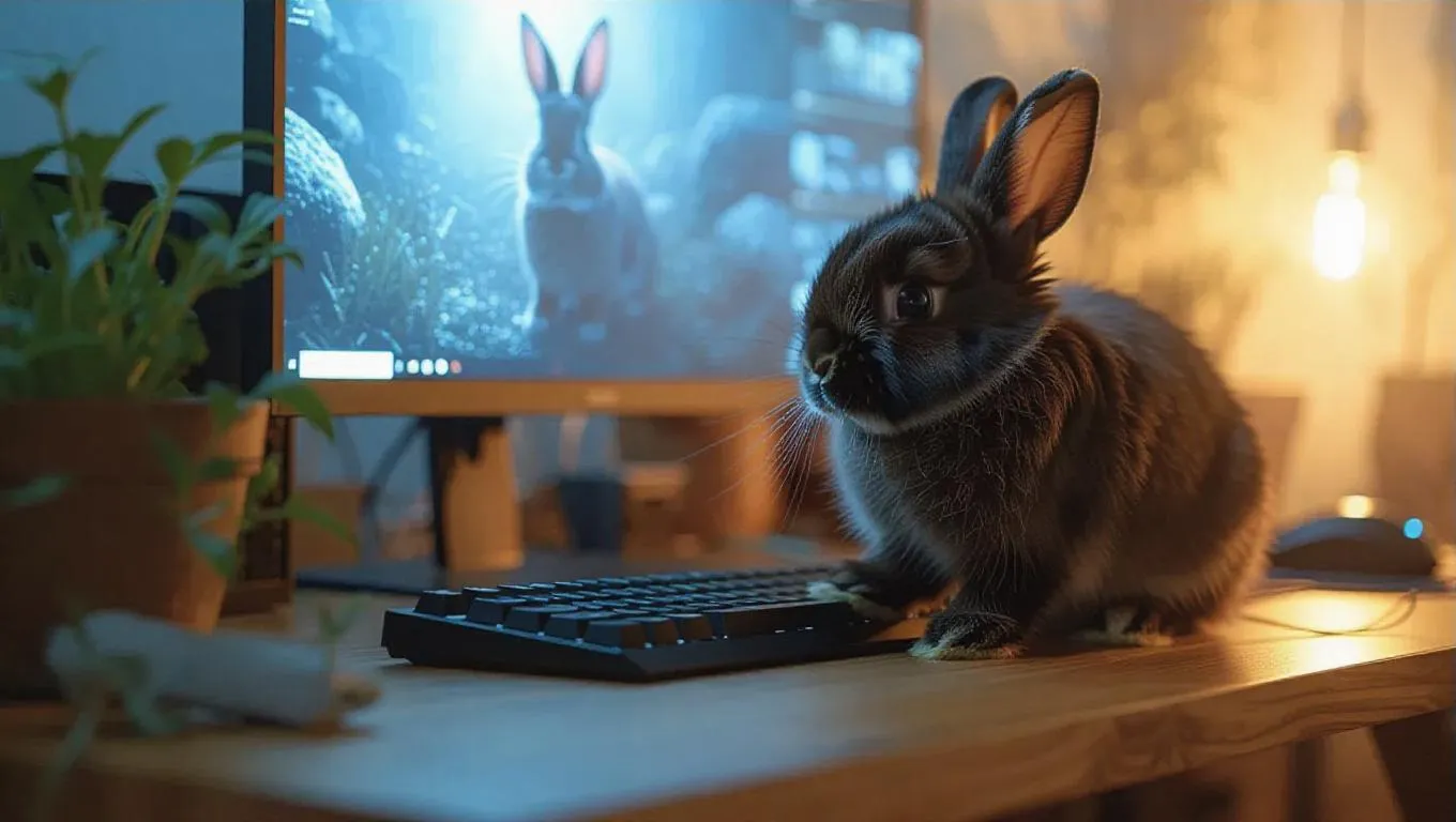 A small fluffy chocolate rabbit stands on an elegant desk, its paws awkwardly pressing keys as it types thoughtfully. The rabbit glances nervously at the monitor, where a live stream shows an exciting event. The camera zooms in, capturing the anticipation and curiosity in the rabbit’s eager eyes, set against a backdrop of dim, suspenseful lighting.