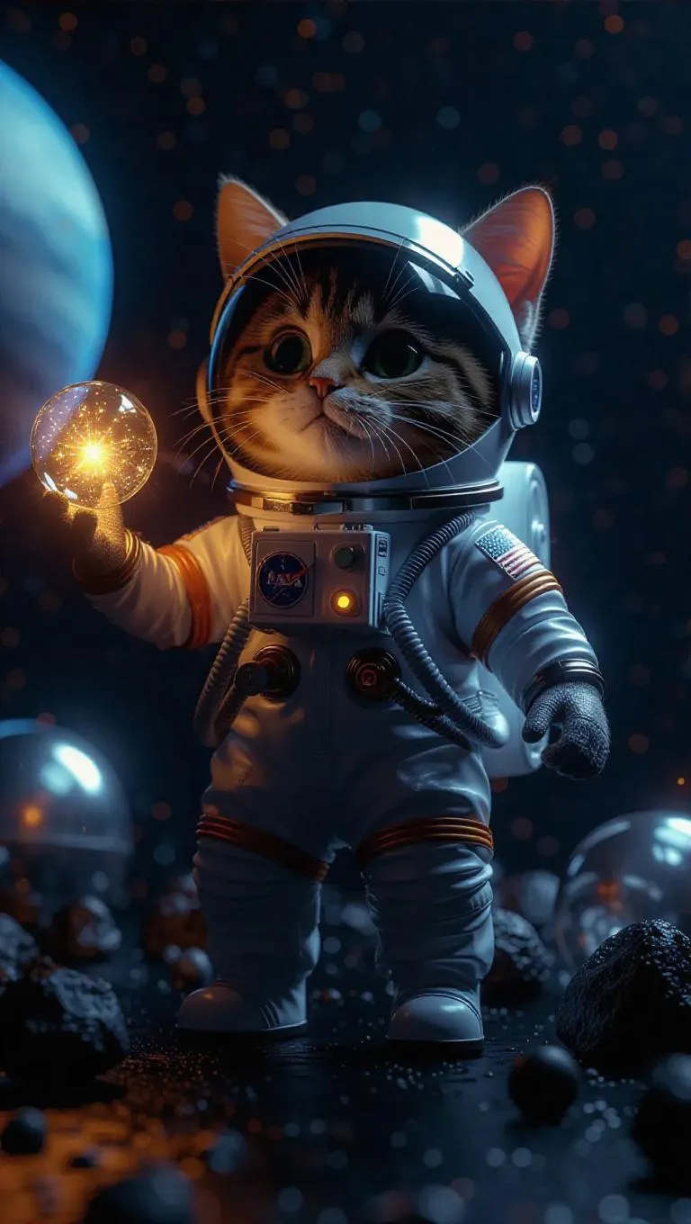 A 3D cat image wearing an astronaut's suit and helmet, standing upright on two legs like a human, holding a glowing orb, surrounded by space equipment and stars, exuding a cosmic and innovative atmosphere, with a spark of adventure in its eyes.