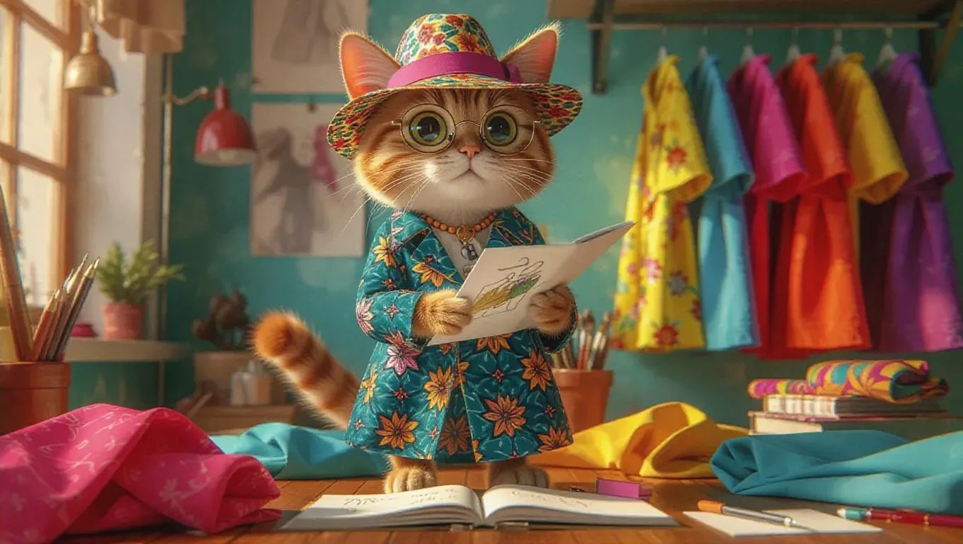 A 3D cat image wearing a fashion designer's outfit and hat, standing upright on two legs like a human, holding a sketchbook, surrounded by fabric and design tools, exuding a stylish and innovative atmosphere, with a spark of inspiration in its eyes.