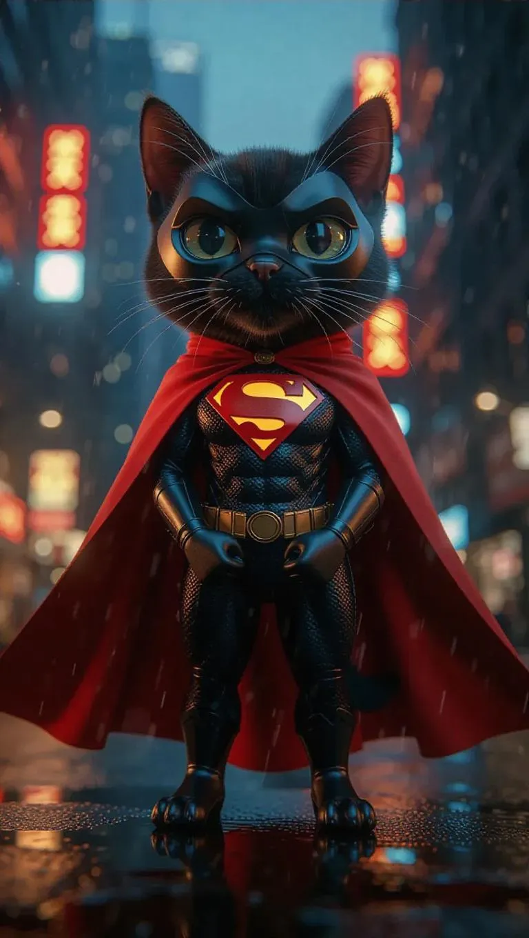 A 3D cat wearing a sleek superhero cape and mask, standing upright on two legs like a human, striking a dynamic heroic pose, surrounded by a bustling city skyline, bathed in dramatic lighting, exuding a bold and inspiring atmosphere.