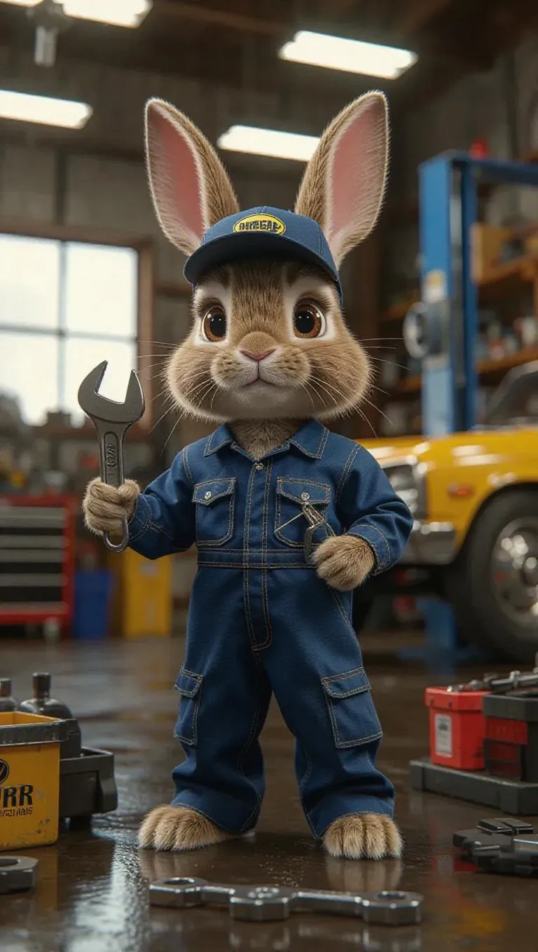 A 3D bunny in a mechanic's jumpsuit and cap, standing upright on two legs, holding a wrench with a focused expression. Surrounded by a toolbox and a car lift, the scene exudes a hardworking and industrious atmosphere, with natural lighting and garage decor.