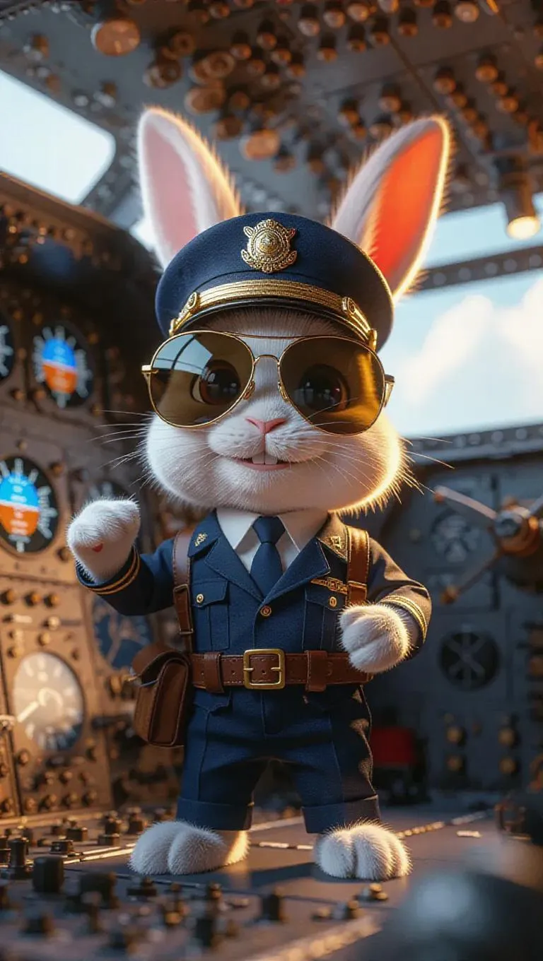 A 3D bunny wearing a pilot's uniform and cap, standing upright on two legs, holding a pair of aviator sunglasses with a cheerful expression. Surrounded by an airplane and flight controls, the scene exudes an adventurous and exhilarating atmosphere, with bright lighting and aviation decor.