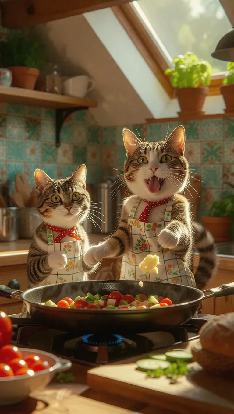 Animal chefs in a bright, tidy kitchen. Dog wearing an apron, sautéing vegetables in a frying pan. Colorful ceramic tiles, sunlight pouring in through skylights. Cat chopping herbs, mouse sprinkling cheese. Tail-shaped salad bowls, cucumber strips, bread baskets. Cheerful, lively, fresh, delightful atmosphere.