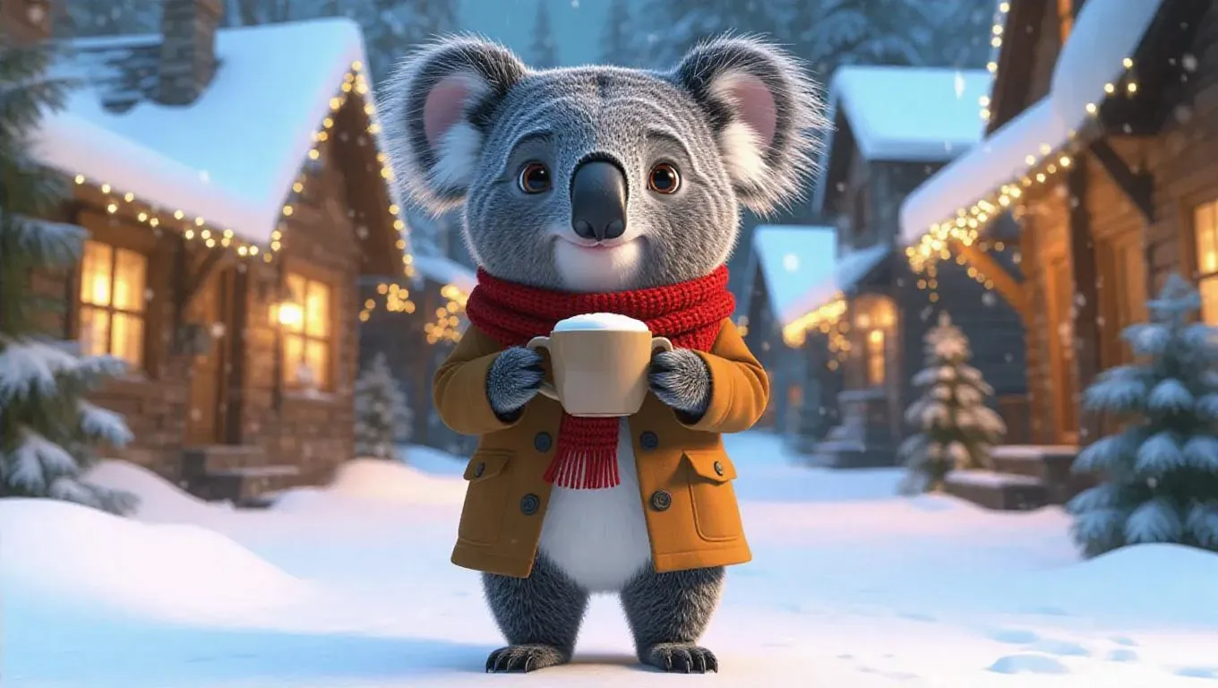 Text to ImageA 3D koala image wearing a winter coat and scarf, standing upright on two legs like a human, holding a hot drink, surrounded by snow and a festive village, exuding a cozy and warm atmosphere.Recreate