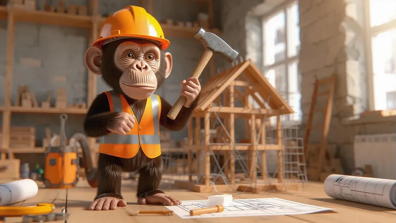 A 3D monkey image wearing a construction worker's helmet and vest, standing upright on two legs like a human, holding a hammer and building a house on a construction site, surrounded by tools and blueprints, exuding a hardworking and industrious atmosphere.