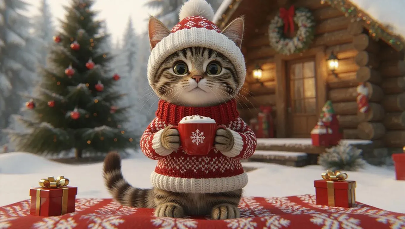 Text to ImageA 3D cat image wearing a cozy sweater and wool hat, standing upright on two legs, holding a cup of hot cocoa, surrounded by a winter cabin filled with decorations, exuding a warm and festive atmosphere.Recreate