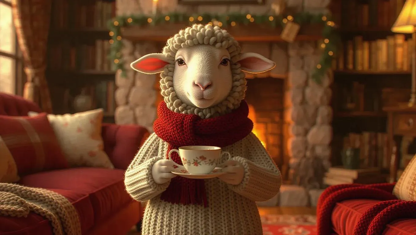 A 3D sheep image wearing a stylish sweater and scarf, standing upright on two legs like a human, holding a cup of tea, surrounded by a cozy living room and warm fireplace, exuding a relaxed and comfortable atmosphere, with cushions and bookshelves in the background, adding a sense of homeliness.