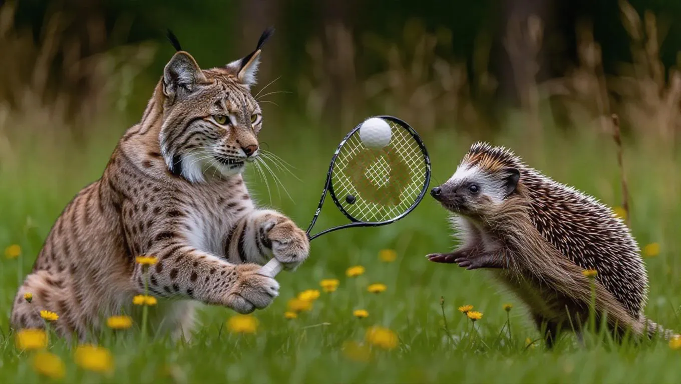 In a peaceful meadow, a lynx and a hedgehog are engaged in a friendly game of badminton. The lynx's quick reflexes help it to return shots, while the hedgehog's smart positioning helps it to make strategic plays. The meadow is filled with laughter as the lynx and hedgehog enjoy their time.