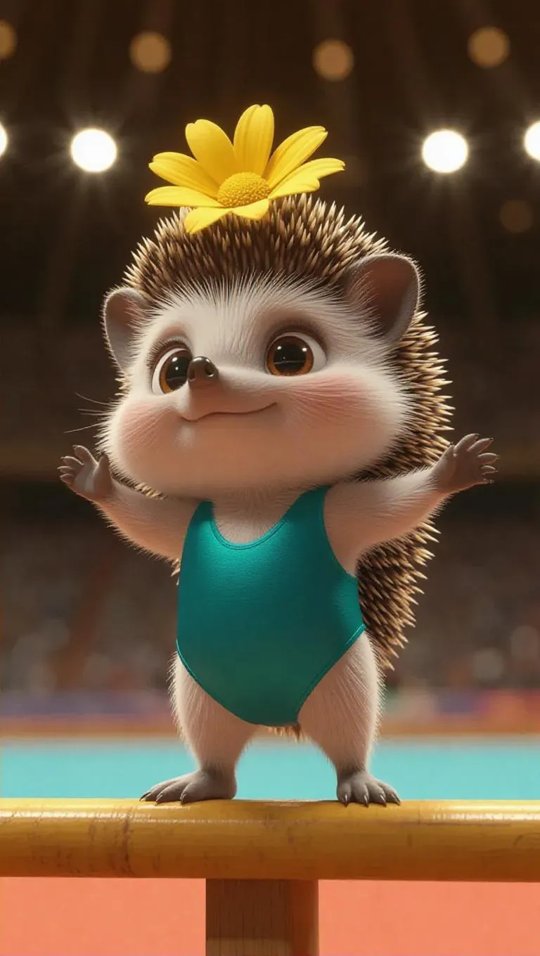 A charming little hedgehog stands on a balance beam, its yellow flower atop its head. The hedgehog wears a teal gymnastics leotard, with soft brown quills and feet. Its eyes are focused, and it appears to be preparing for a graceful spin. The background is a dazzling gymnastics arena, ensuring the focus remains entirely on the hedgehog. The lighting is soft and balanced, enhancing the cute, Pixar-style rendering.