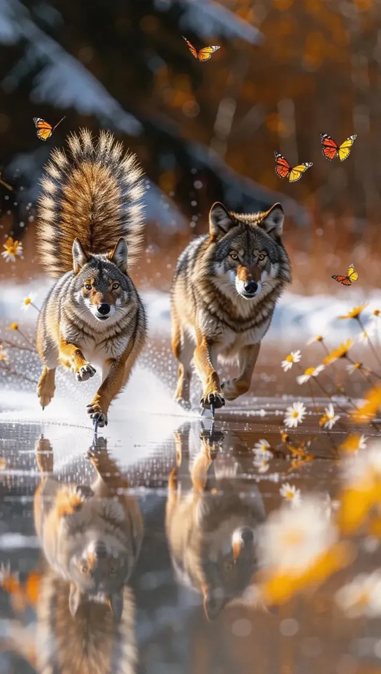 A thrilling speed skating competition on a shimmering frozen lake, showcasing a squirrel, wolf, and caribou. The squirrel’s rapid movements give it a head start, the wolf’s cunning keeps it in close pursuit, and the caribou’s strength helps it keep a steady rhythm. A flock of intrigued butterflies observes from the flowers, their flutters enhancing the atmosphere.