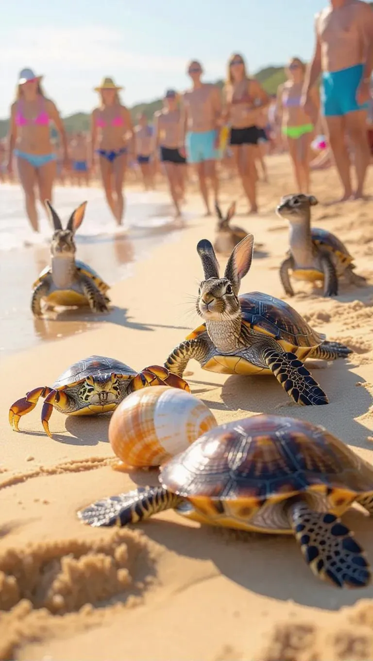 A thrilling relay race takes place on a sunny beach, with teams of animals passing a colorful seashell. A crab, rabbit, and gull form one team, while a turtle, dog, and dolphin make up the other. The animals scurry along the sand, their teamwork and speed on full display as beachgoers cheer them on.