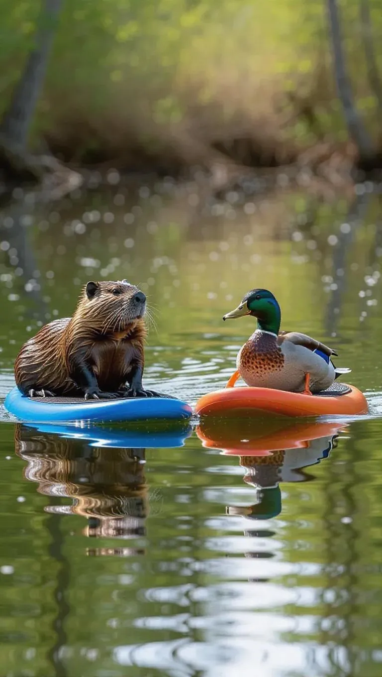 A fun paddleboarding competition on a calm lake, where a beaver, duck, and turtle balance on their boards. The beaver’s strength helps it stay steady, the duck’s speed keeps it in the lead, and the turtle’s determination keeps it in the race. A group of curious fish watches from below, their bubbles rising to the surface.
