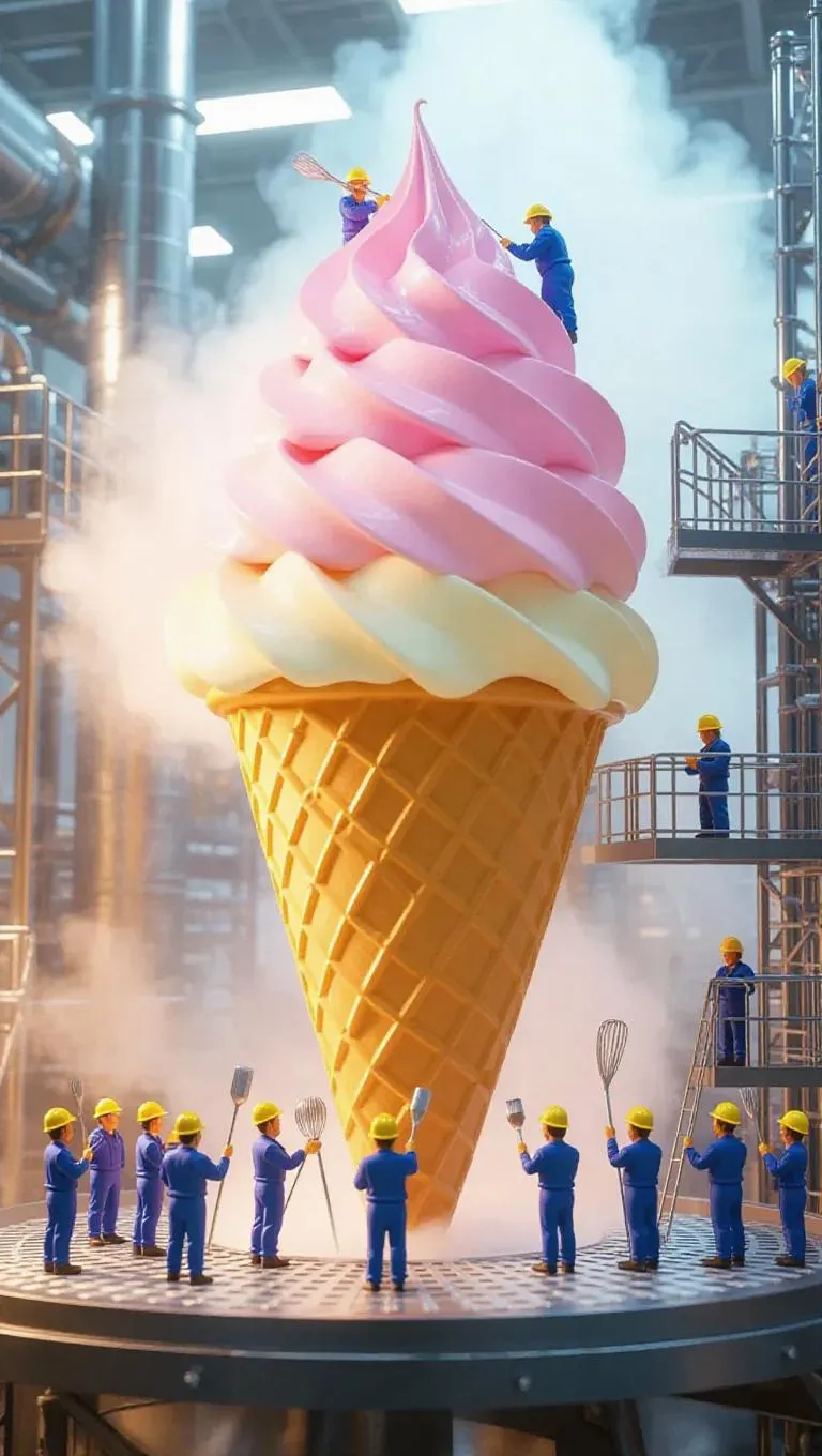A group of tiny workers in hard hats and uniforms is busy inside a gigantic ice cream cone. Some are blending flavors with oversized whisks, while others are chilling ingredients on a small conveyor system, as crisp fog rises like factory exhaust. The whole setup resembles a vibrant ice cream plant, with beams and ladders throughout the cone.