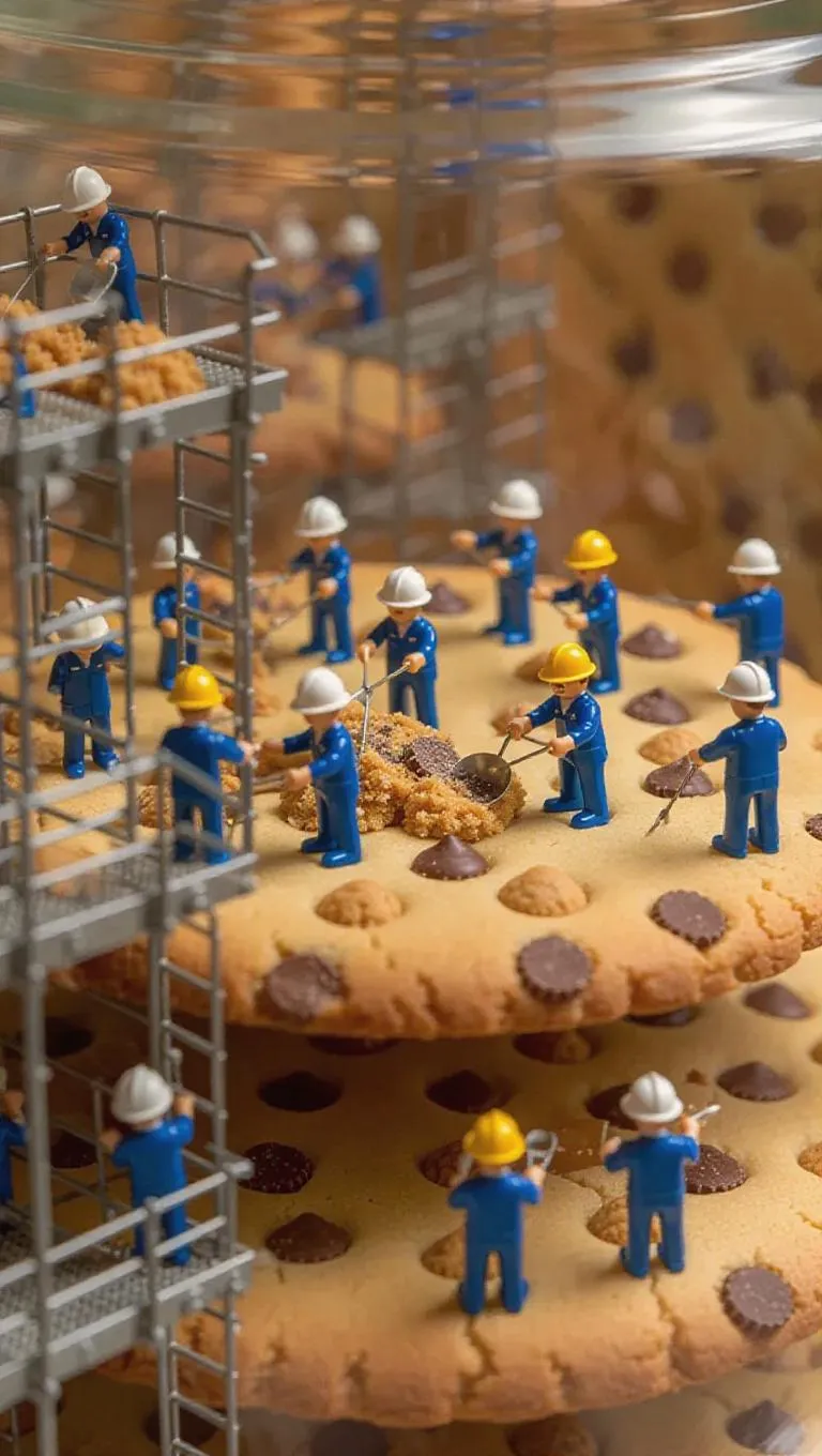 A band of tiny workers in protective helmets and aprons is working within a gigantic cookie jar. Some blend cookie dough with giant mixers, while others place chips on a miniature line, as sweet scents rise like fog. The whole setup looks like a busy cookie-making operation with ramps and ladders inside the jar.