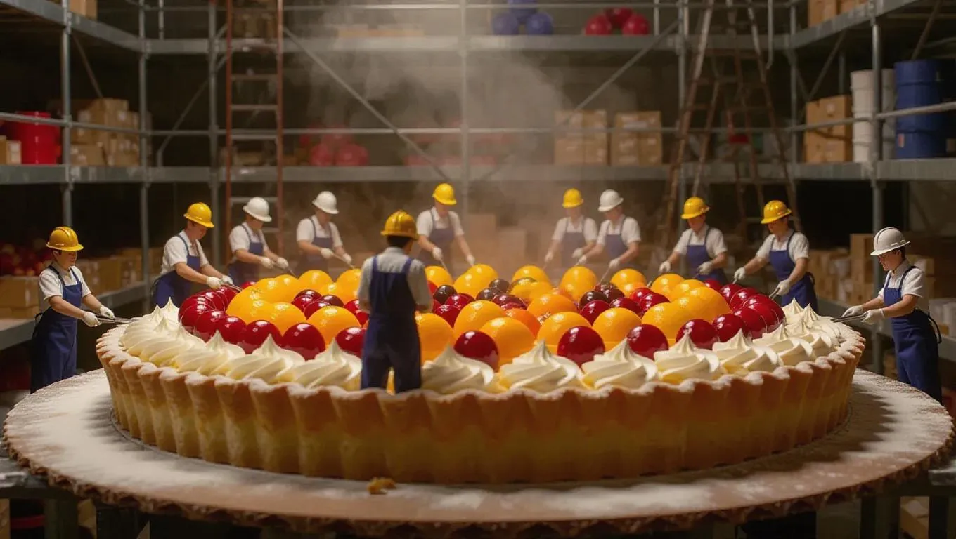 A crew of small workers in hard hats and aprons is engaged within an oversized fruit tart. Some mix pastry cream with giant spatulas, while others layer fruits on a miniature conveyor, as steam wafts like background noise. The full ambiance resembles a busy tart factory, with scaffolding and ladders present.