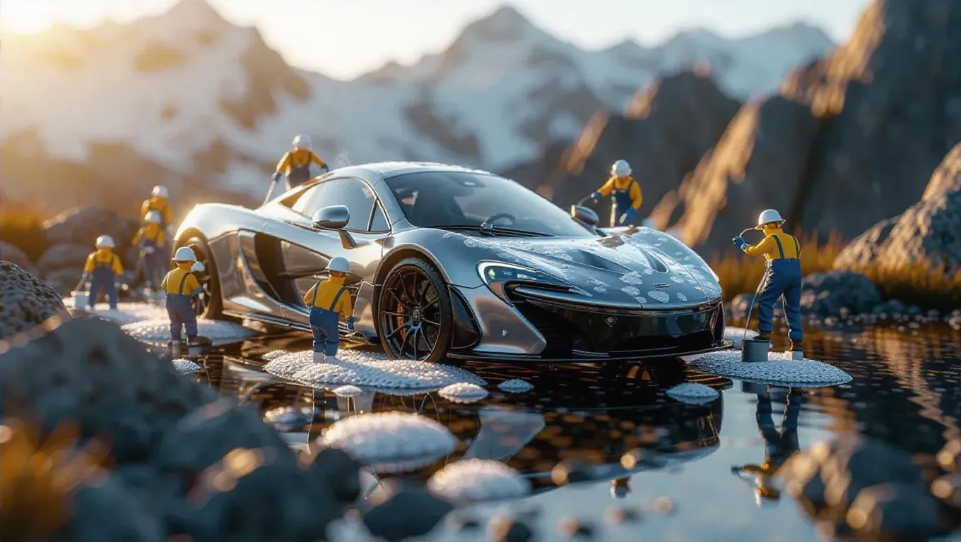 A group of tiny, thumb-sized workers is diligently cleaning a stunning, silver sports car, which is the centerpiece of the image. The car is parked on a rocky mountain path, and has white splatters on its side, indicating that it has been recently washed or sprayed. The miniature workers are scattered around the car, some standing closer to it while others are further away. They appear to be focused on their task, using tiny sponges and water cans to scrub and rinse the vehicle. The surrounding environment is dominated by a clear, stars-filled sky, which casts a wondrous light over the scene. There are no other objects or people visible in the image, and no text or distinctive markings are present.