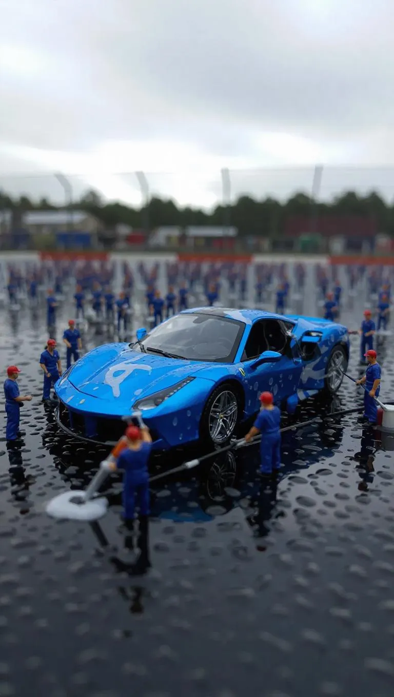 A group of tiny, thumb-sized workers is diligently cleaning a shiny blue sports car, which is the centerpiece of the image. The car is parked on a wet surface, possibly a racetrack or showroom floor, and has gray splatters on its side, indicating that it has been recently washed or sprayed. The miniature workers are scattered around the car, some standing closer to it while others are further away. They appear to be focused on their task, using tiny mops and buckets to scrub and rinse the vehicle. The surrounding environment is dominated by a cloudy, dusk sky, which casts a muted, soft light over the scene. There are no other objects or people visible in the image, and no text or distinctive markings are present.