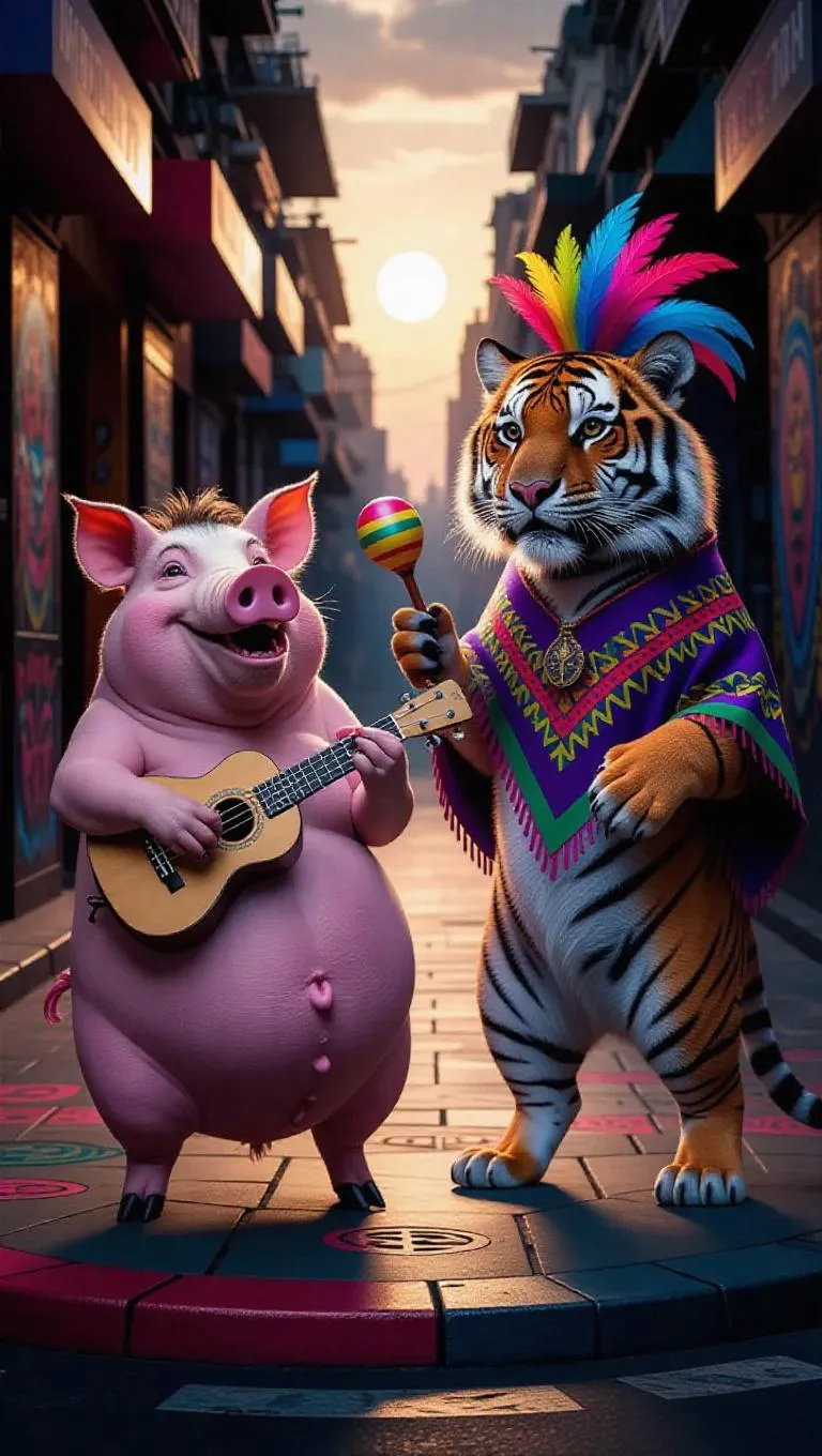 An adventurous pig is strumming a ukulele on a vibrant street corner. The tiger, wearing a colorful poncho and feathered headgear, holds a maraca in its front paw. The corner is alive with street art and murals. The setting sun casts a golden hue over the scene, adding to the festive and artistic atmosphere.