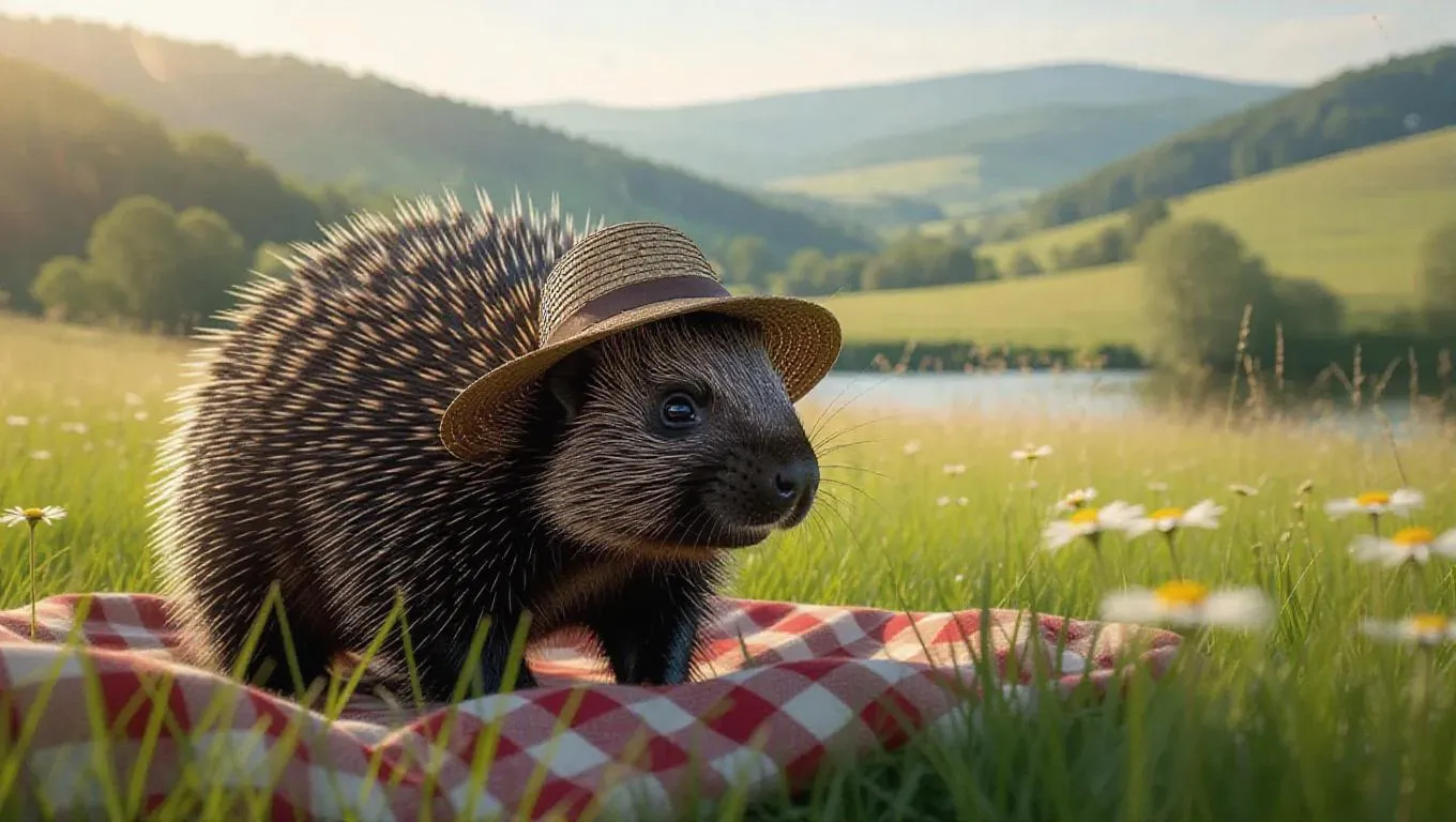 A curious porcupine wanders through a peaceful countryside, its quills blending with the lush green grass. The porcupine wears a sunhat and a picnic blanket, its breath visible in the warm air. Behind it, rolling hills stretch endlessly, dotted with wildflowers. In the distance, a serene river flows gently beside the fields. The air is warm and filled with the scent of grass and flowers.