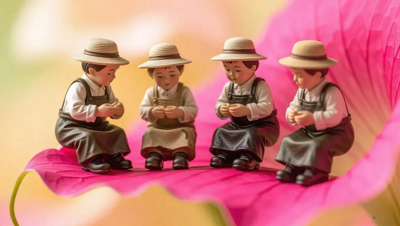 Several thumb-sized figures, clad in earthy aprons and canvas hats, settle on a blossoming arum, gently tracing the edges of its petals with tiny fingers. The elegant petals and tall stems create a tranquil setting, capturing a moment of reflection and care.
