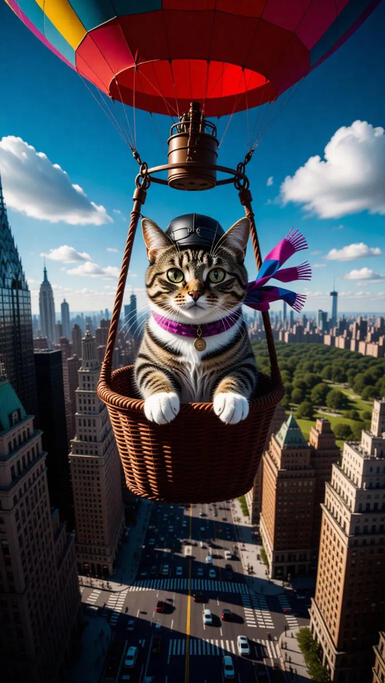 A curious cat rides a hot air balloon over a bustling city, its paws gripping the basket’s edge. The cat wears a tiny aviator hat and a scarf fluttering in the wind. Below, skyscrapers and busy streets stretch out, with cars and people moving like tiny ants. In the distance, a large park offers a green oasis amidst the urban sprawl. The sky is a vibrant blue, with a few fluffy clouds drifting by.