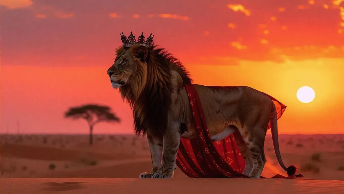A powerful lion stands defiantly at the stark edges of the Sahara in Gambia, its mesmerizing mane rippling in the evening breeze. The lion dons an elegant crown and a stunning draped cape adorned with mystical symbols. Endless golden dunes stretch far behind, their warm shades catching fire against the sun's farewell. A distant silhouette of a lone tree emerges against the skyline. The sky transitions to an array of reds and purples, enhancing the ambiance.