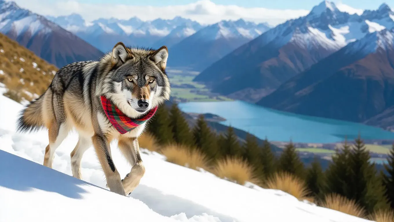 A brave wolf hikes through the undulating hills of New Zealand's Southern Alps, its paws sinking into the damp snow. The wolf dons a thick fur coat and a bright scarf fluttering in the wind, its breath visibly escaping in puffs. Behind it, immense mountains and shimmering rivers rise, their surfaces sparkling under the midday sun. In the distance, a small glacial lake reflects the vivid blue sky, its waters calm and serene. The atmosphere is invigorating, filled with the spicy aroma of native trees.