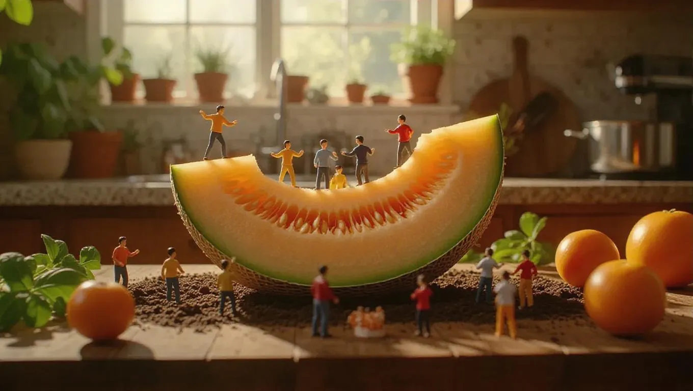 The camera begins with a close-up of the intricate details of the cantaloupe segments, showcasing the vibrant orange flesh. It then performs a slow push-in, gradually revealing miniature thumb-sized people engaged in various activities around the cantaloupe. The figures move subtly, enhancing the sense of depth and playfulness. The natural textures of the surrounding soil and vegetation remain in focus, adding to the scene's charm. The setting is a bright farmhouse kitchen with fresh produce and the distant sound of sizzling pans.