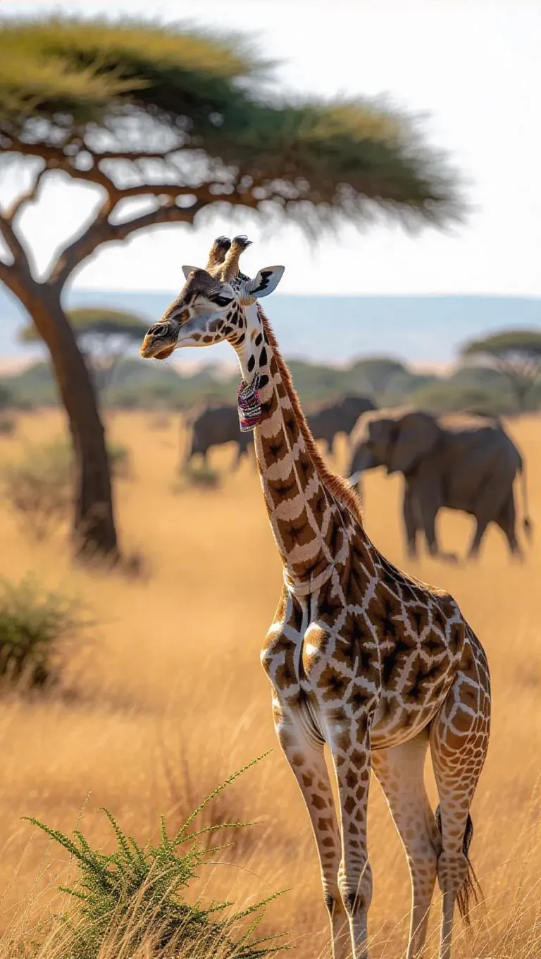 An inquisitive giraffe ambles through the open savannahs of the Serengeti, Tanzania, its elongated neck swaying as it seeks the buds of an acacia tree. This giraffe wears a neckerchief and sporty sunglasses, keenly observing the horizon. Around it, dry grasses and scattered acacia trees create a picturesque backdrop, their surfaces gleaming under the afternoon sun. In the distance, a family of elephants wanders leisurely, their trumpeting resonating softly across the landscape. The air is warm, filled with the essence of vegetation and earth.