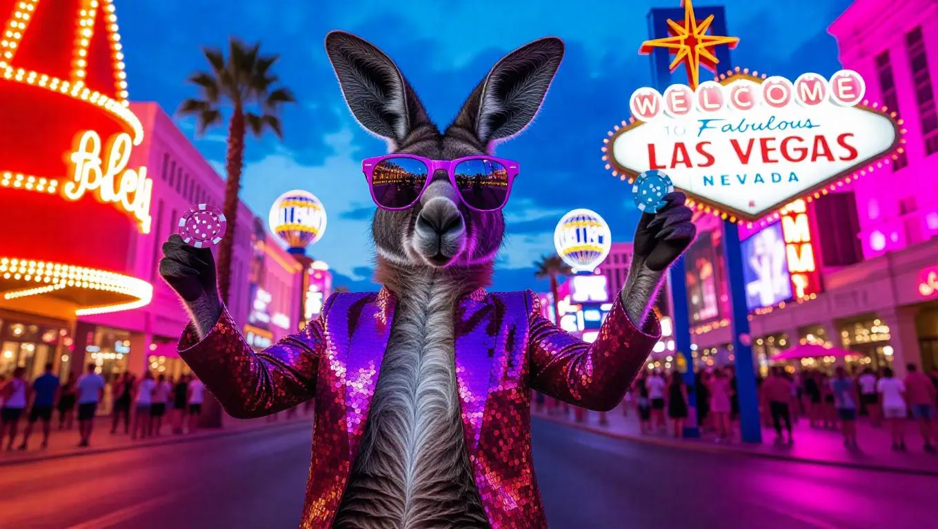 A vibrant kangaroo hops through the dazzling streets of Las Vegas, USA, holding a poker chip in one paw. The kangaroo wears a sequined jacket and a pair of flashy sunglasses, its pouch filled with candy. Around it, the bright lights of the Strip rise up, and the streets are filled with party-goers and entertainers. In the distance, the famous Welcome to Fabulous Las Vegas sign stands tall. The air is filled with the scent of popcorn and the sounds of cheers.