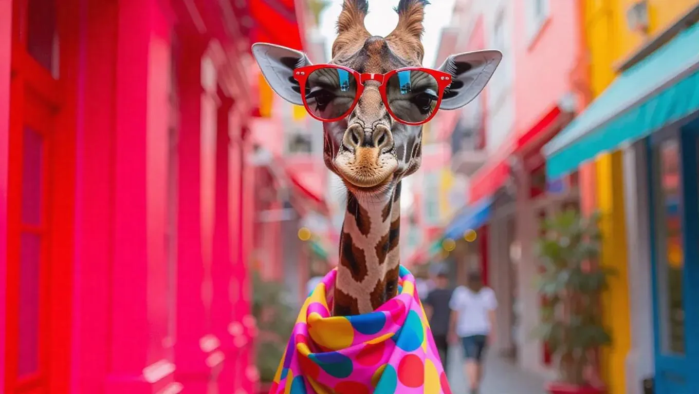 A cheerful T 台 scene featuring a striking giraffe strutting confidently in a stylish scarf, wearing chic oversized shades, creating a whimsical and bright atmosphere.