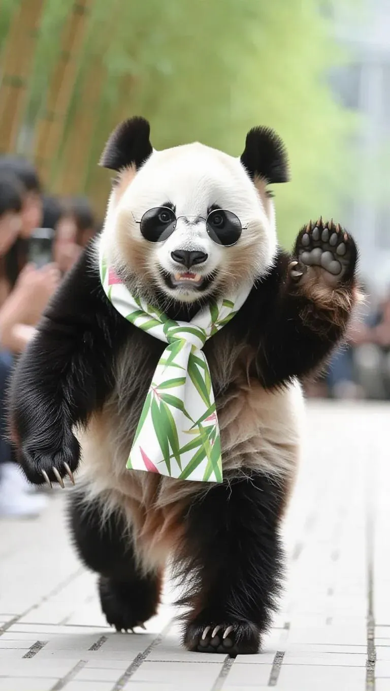 A chubby panda ambles down the runway with a carefree grin, its black-and-white fur making it instantly recognizable. It wears a bamboo-patterned scarf and a pair of round sunglasses, adding a playful and trendy vibe. The panda's clumsy yet lovable movements bring smiles to everyone.