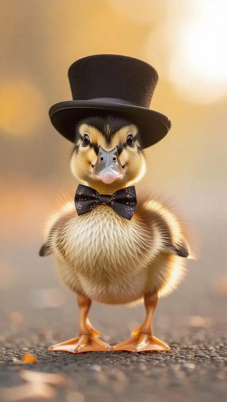 A baby duckling waddles down the runway, its soft brown feathers glowing warmly. It wears a tiny top hat and a bow tie, giving it a formal theme. The duckling's quacks and wobbly steps are irresistibly cute.