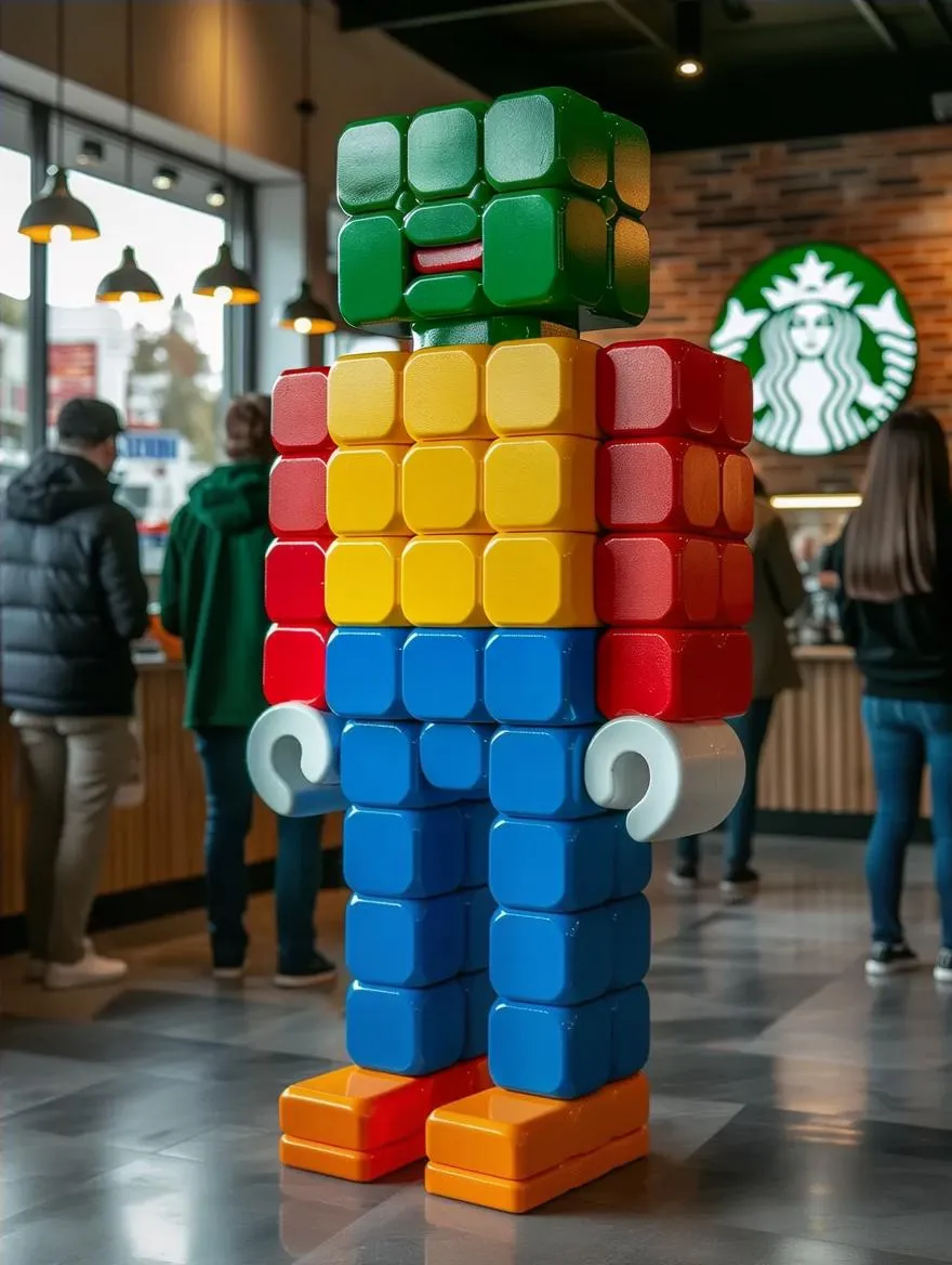 Generate a vibrant, human-shaped Rubik's Cube character waiting in line at Starbucks using this AI image generation tool. Featuring a vivid palette: red arms, yellow chest, blue legs, white hands, green head, and orange feet. Create unique AI art with detailed prompts effortlessly on vivago.ai.