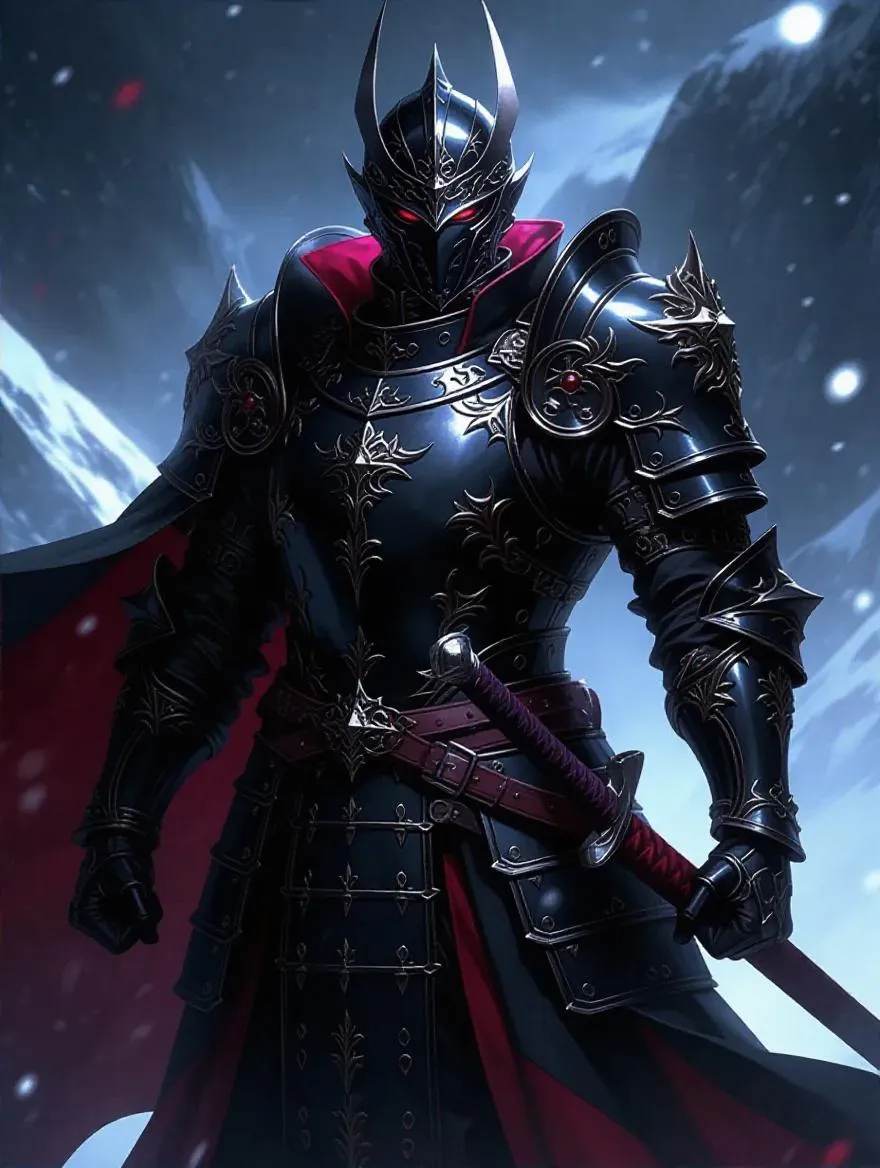 Craft striking game art of Akechi Mitsuhide in winter armor with a bold black, dark-gray, white, red, and purple palette. Elevate your AI-generated visuals using Vivago.ai's advanced tools for dynamic, professional-grade character designs inspired by historical warriors and modern gaming aesthetics.