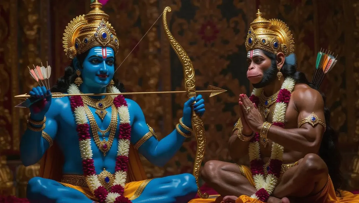 Lord Rama with radiant blue skin, adorned in exquisite golden jewelry, holding a majestic bow and arrow, exuding a serene and merciful expression. Lord Hanuman, with a powerful muscular build, handsome monkey face, and a long tail, kneels in devout prayer, also bedecked in golden ornaments.