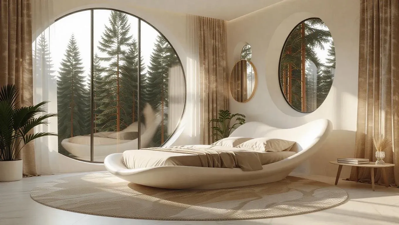 Generate a futuristic, ultra-modern bedroom with a sleek beige sculptural bed featuring smooth wave-like curves. Large circular windows frame serene forest views, sheer burlap curtains diffuse soft natural light. Minimalist monochromatic interiors, clean lines, photorealistic style. Perfect for AI image generation of high-detail, wide-angle serene spaces with natural lighting.