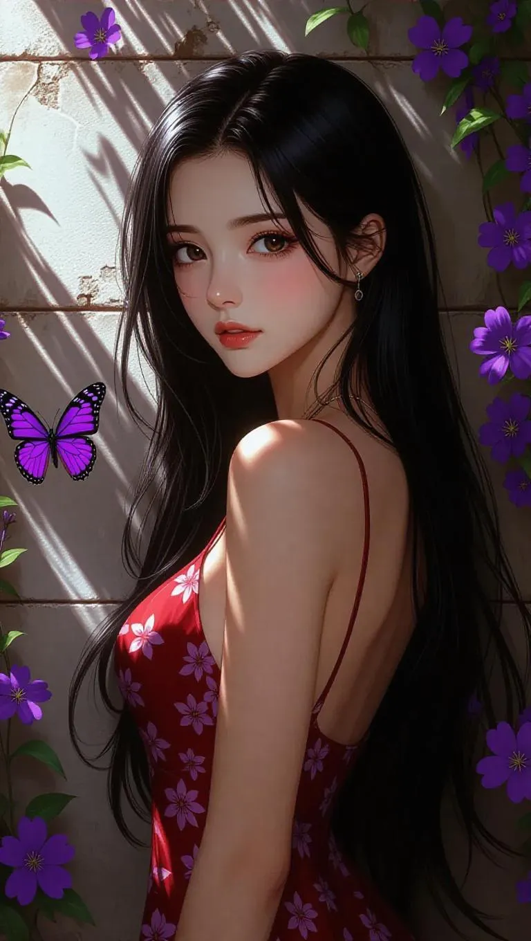 Vibrant anime mural transforms ancient communities with hyperrealistic details. Anime girl with flowing black hair wears red spaghetti strap dress, surrounded by blooming purple flowers and ivy vines. Soft pastel colors blend anime aesthetics with mural textures, creating dreamy urban scenes. Experience calm elegance through hyperrealism, delicate linework, and immersive cityscape ambiance in this AI-generated artwork.