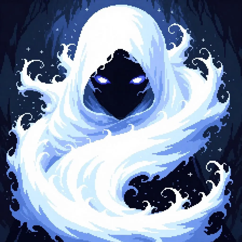 Light pixel art style, Accused Fell Spirit with ghostly-white and eerie gray color palette, haunting eyes glowing faintly, surrounded by swirling mist, set against a dark, moody backdrop, exuding an otherworldly presence.