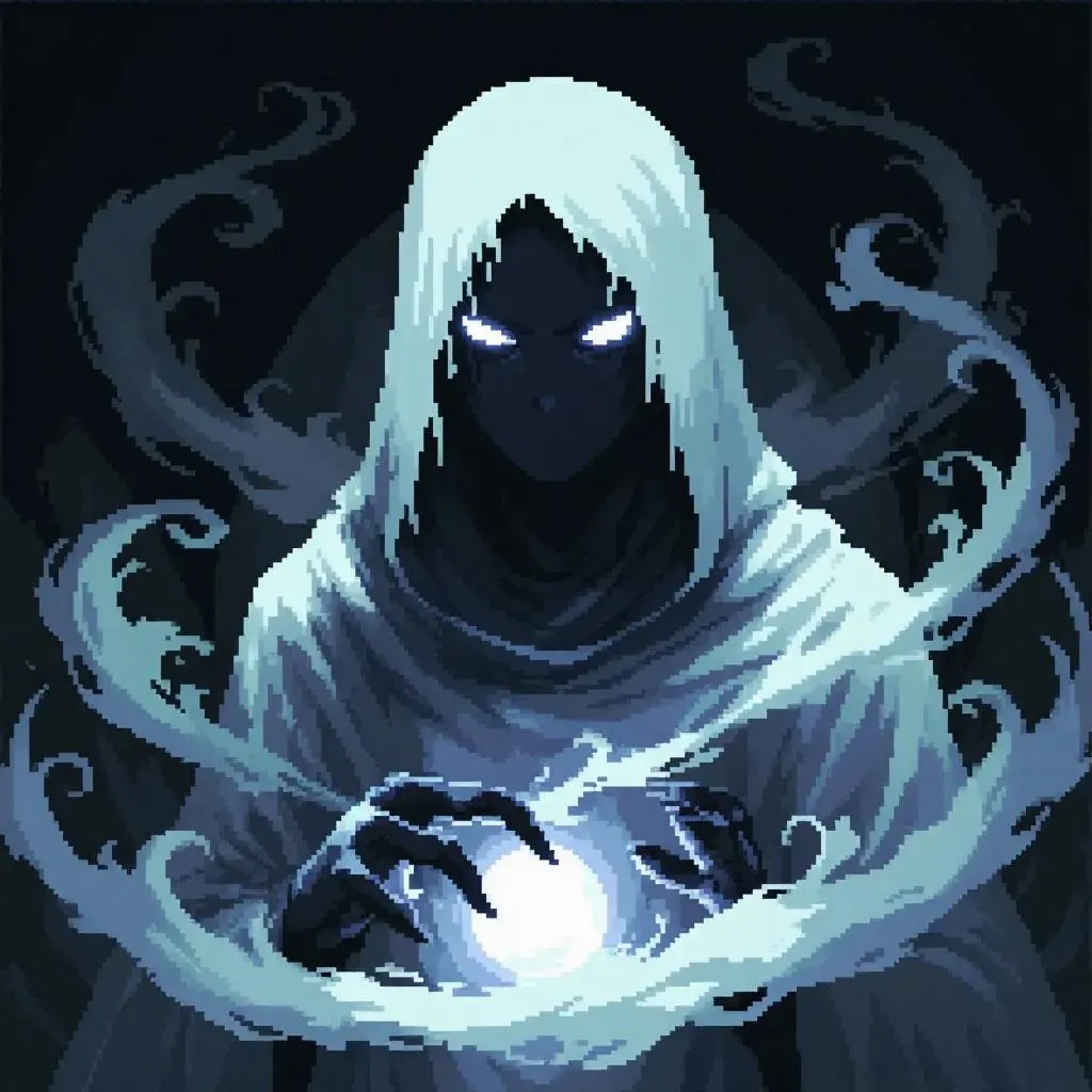 Text to ImageLight pixel art style, Accused Fell Spirit with ghostly-white and eerie gray color palette, haunting eyes glowing faintly, surrounded by swirling mist, set against a dark, moody backdrop, exuding an otherworldly presence.Recreate
