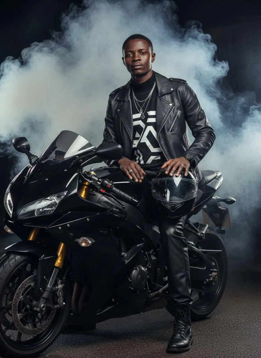 Strict identity verification is performed using the uploaded avatar (maintaining consistency in facial features, hair, skin tone and age). A close-up shot is adopted, focusing on the upper body with the face positioned at a three-quarter angle. Create a realistic portrait of the man in the reference photo sitting on a sleek black sports motorcycle on a midnight street. The background features thick smoke illuminated by high-contrast lighting. He is wearing a loose black T-shirt with a striking white pattern, a black leather jacket, loose black leather pants and black leather boots. His accessories include a black wristwatch, trendy ring accessories and necklaces—a thin chain necklace layered with another chain. His right hand rests on the motorcycle, holding a clean, glossy black helmet with a clear visor. The motorcycle (a high-end, luxury model) is rich in intricate details, featuring a large engine, a sturdy frame and shiny chrome trimmings, which accentuate a modern and powerful impression. His expression is calm and confident as he stares directly at the camera. The overall style boasts a cinematic and fashionable feel, with ultra-high resolution, photorealistic detail, an editorial aesthetic, fashion photography sensibilities, a contemporary fashion portrait style and a high-fashion editorial photography style. The image features dramatic light and shadow contrast, well-defined chiaroscuro on the facial contours, professional studio lighting, trendy and stylish attire, and avant-garde fashion photography artistry.