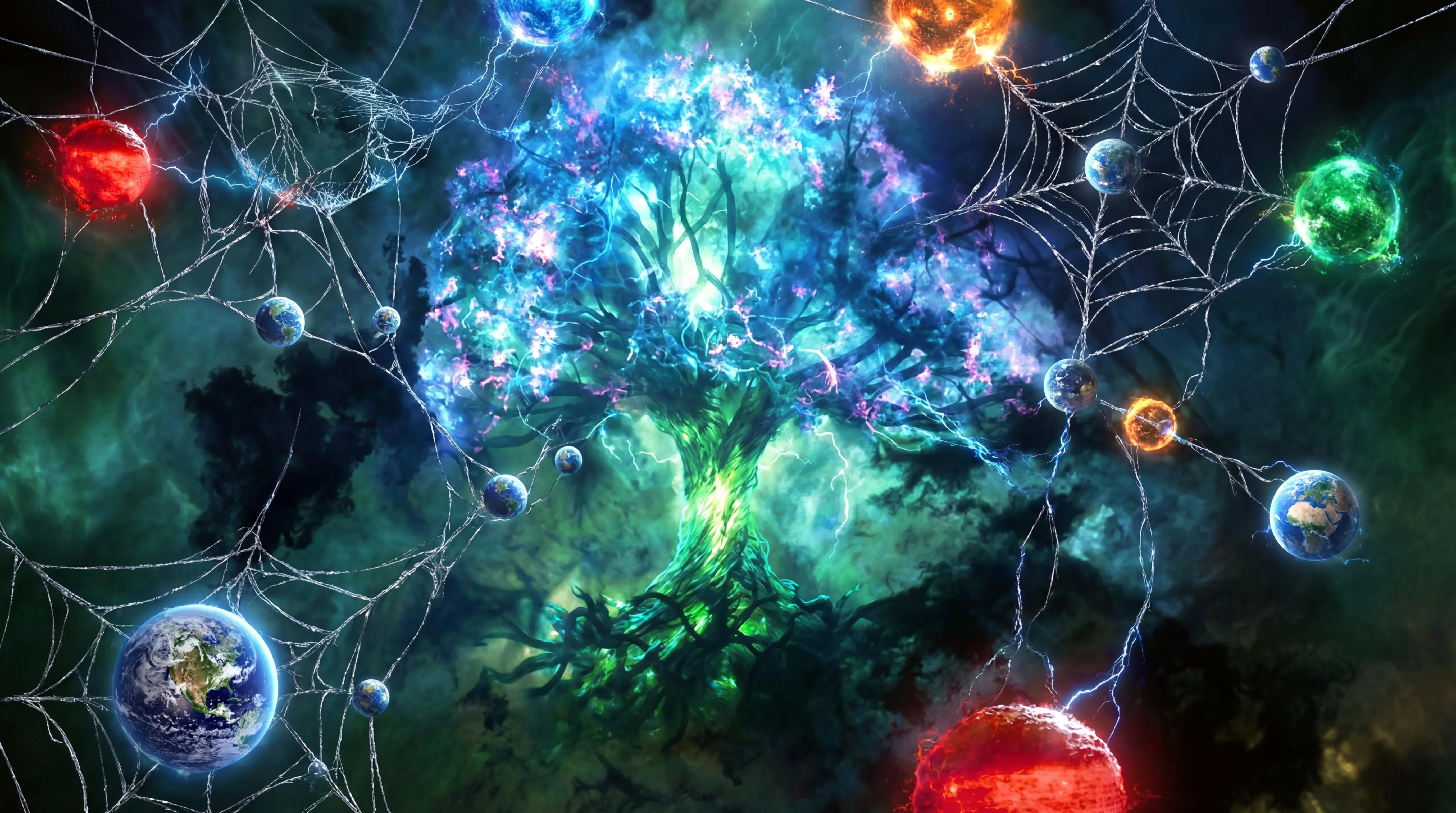 Explore AI-generated visuals merging Marvel, DC, Arrowverse, and Spider-Verse multiverses. See SSU's webs entwine with MCU's branches, Arrowverse's spheres fuse with DCEU's orbs. Create stunning multicolored, web-tree branched dimensional concepts. Generate this iconic cosmic convergence using AI art tools. No people. (47 words)