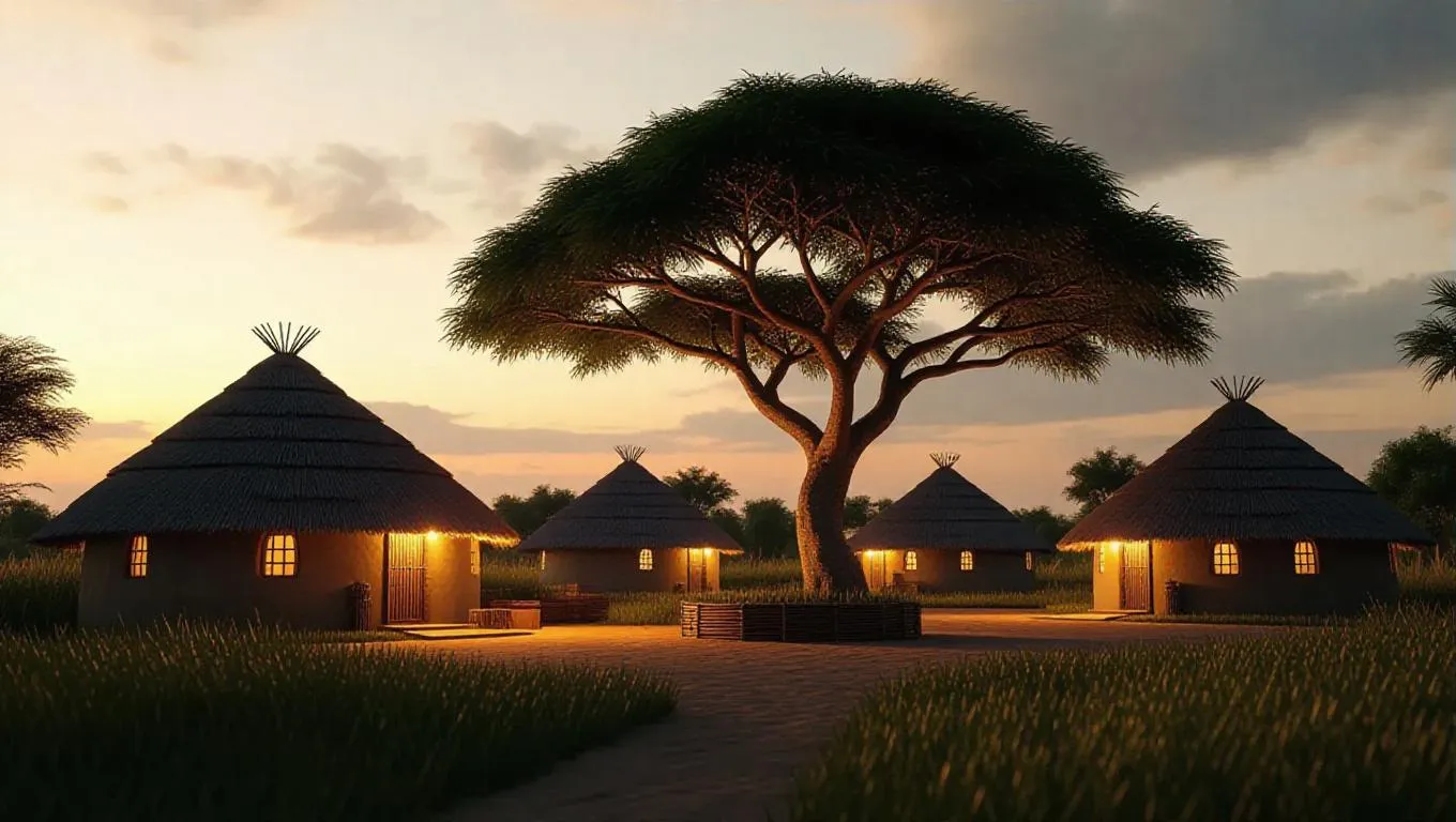 Generate captivating AI visuals of an African homestead with traditional round huts, a kraal, and a central tree under a moonlit night. Ideal for cultural storytelling, historical imagery, and AI-generated African village scenes with vibrant nocturnal ambiance.