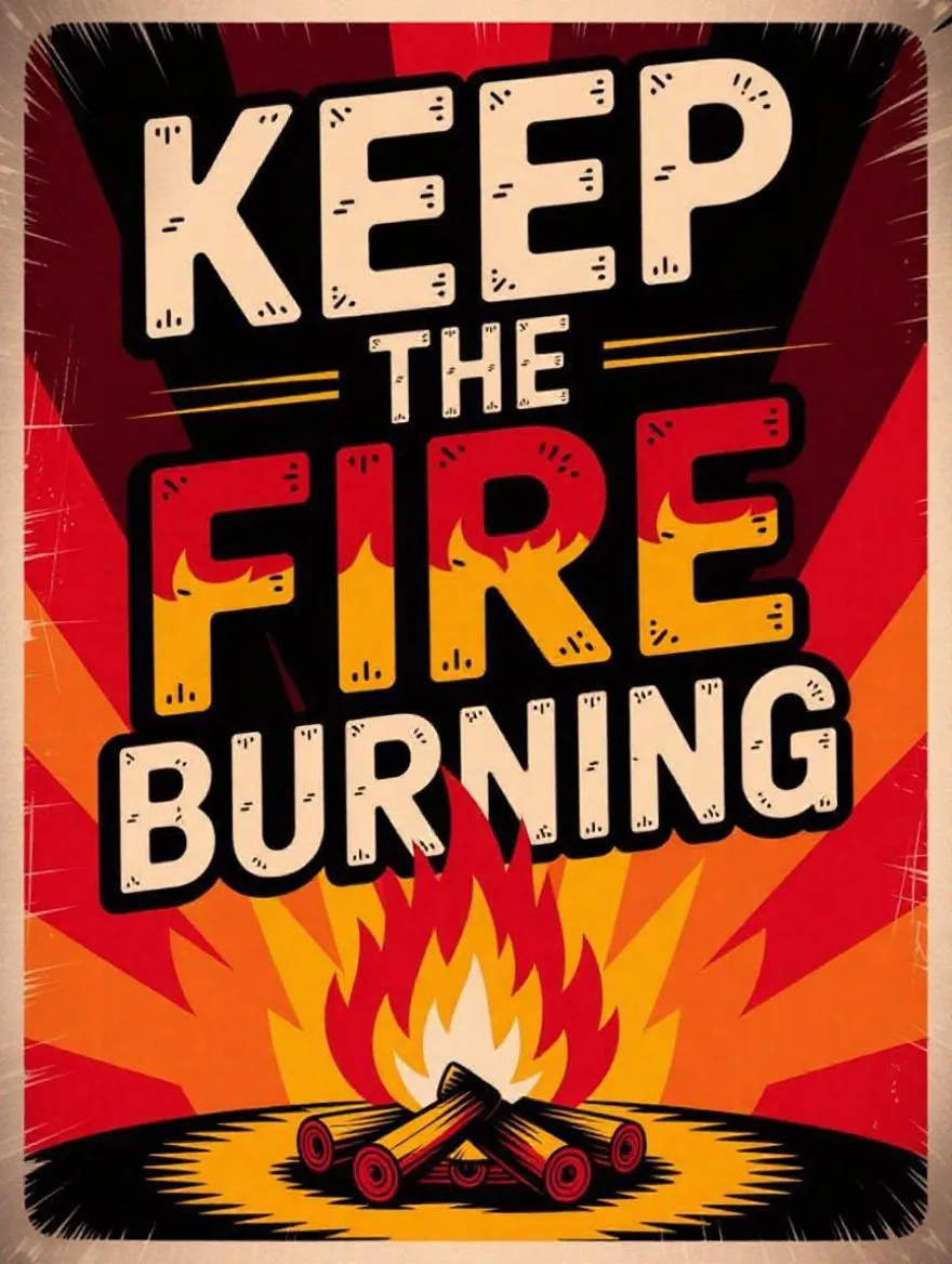Generate a vintage-style motivational poster with "Keep the Fire Burning" text. Vivago.ai creates designs featuring bold retro typography, a detailed illustrated campfire with warm color gradients (red, orange, yellow), and a dark-to-warm fading background. Produce minimal, powerful AI artwork symbolizing perseverance and passion.