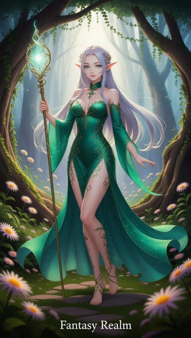 Create an anime-style scene for the theme 'Fantasy Realm,' featuring a beautiful elven priestess with long silver hair and emerald eyes. She stands gracefully in an enchanted forest, holding a single glowing staff adorned with intricate vines. Her elegant, flowing green dress shimmers with magical light, and the background is filled with glowing flowers, ancient trees, and a soft, ethereal mist. Emphasize her serene expression and natural, proportionate form.