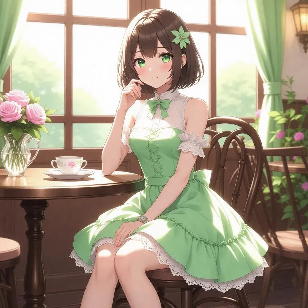 Create AI-generated anime art of Kinomoto Sakura in girly style with lace dresses, pastel hues, and floral prints. Ultra-detailed fashion magazine cover art featuring a chic cafe high tea scene, delicate accessories, and soft lighting for dreamy, professional-grade anime visuals.