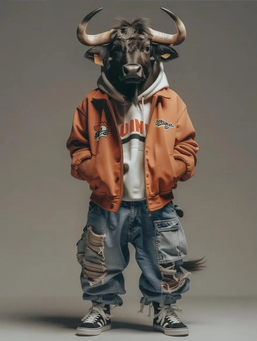 Generate an anthropomorphic ox in streetwear standing on two legs. Create hyperrealistic AI-generated images of this full-length character with a neutral background. Explore Vivago.ai to transform text prompts into professional visuals.