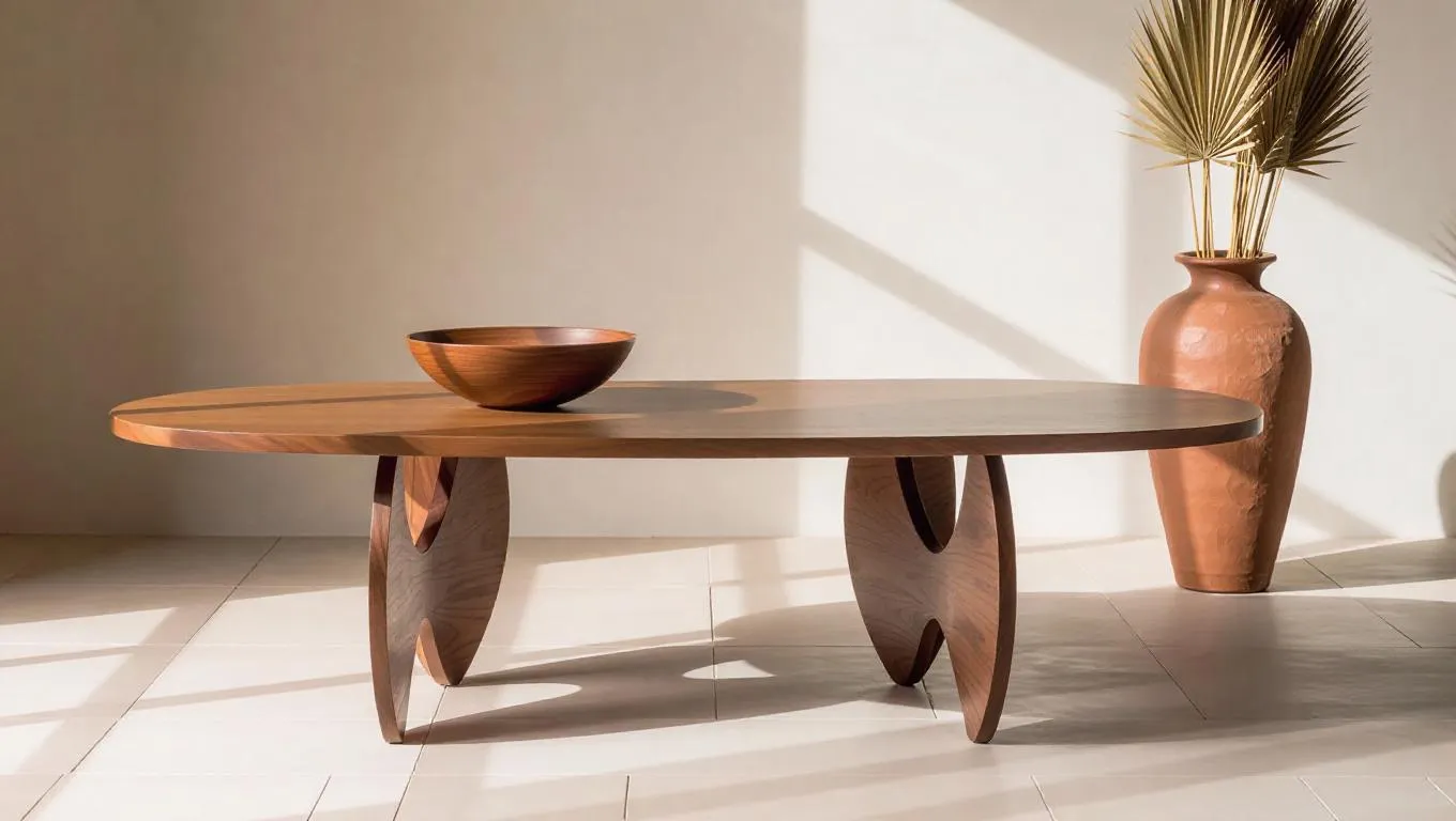 Craft minimalist interior designs with AI. Generate professional studio photos of modern spaces featuring sculptural wood tables, ceramic vases with dried grasses, and natural textures. Achieve a clean aesthetic with warm wood tones, neutral walls, light tiled floors, and perfect golden ratio composition. Create elegant, earthy settings effortlessly.