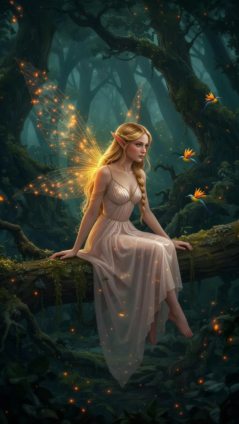 Discover an AI-generated fairy with golden-orange wings in a mystical forest. Blonde elegance meets dark ancient trees, glowing sparks, and birds of paradise. Create enchanting visuals with Vivago.ai’s magic.
